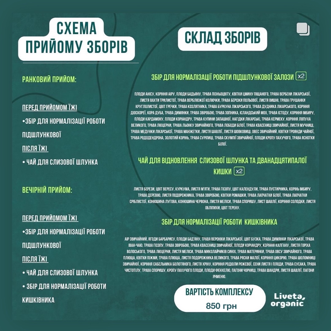 Замовте наш фітокомплекс сьогодні і почніть шлях до здорової травної системи! Курс лікування 20 днів. До комплексу входить 2 збори для підшлункової, два чаї для шлунку та 1 збір для кишечнку